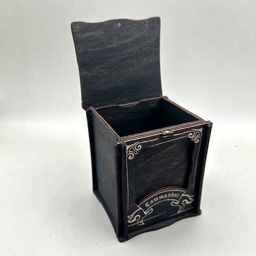 Card storage box with a slot for your Commander. GFor 100+ sheeved cards this box is handmade with birch and has a magnetic clasp.