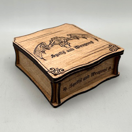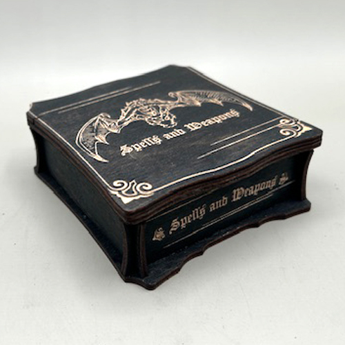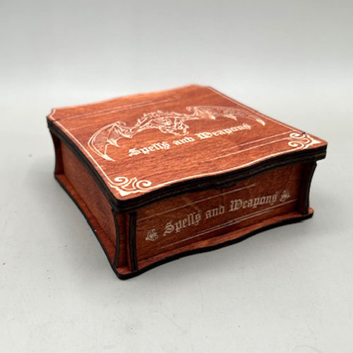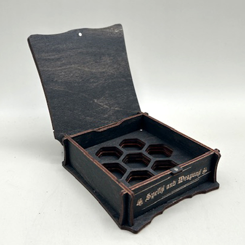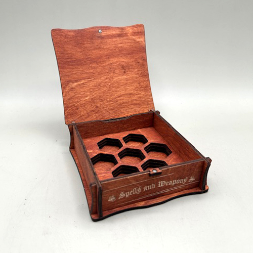 This dice box has seven spots for all your spells and weapons (eg: dice) and has a magnetic clasp. Made of birch and hand stained.